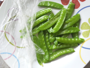 ![]() ⑭スナップエンドウは、耐熱皿に入れ、ラップをかけてレンジで2分加熱したら、すぐに冷水にとり、色止めしましょう。 |