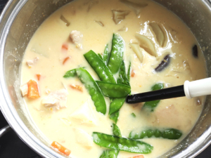 ![]() ⑮ルーの中に、じゃがいもとスナップエンドウも加え、全体をかき混ぜればOK。 |