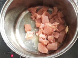 ![]() ②大きめの鍋にマーガリン大1(分量外)を溶かし、鶏肉を加えて軽く白くなるまで炒めましょう。 |