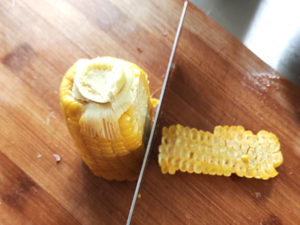 ![]() ⑤ゆでとうもろこしは、実だけを包丁でこそぎ取ります。 (ゆでとうもろこしがない場合は、缶詰のコーンでもOKです。) |