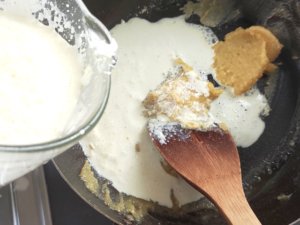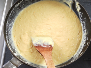 ![]() ⑧フライパンにミキサーの中身を少しずつ加え、クリーム状にします。 |