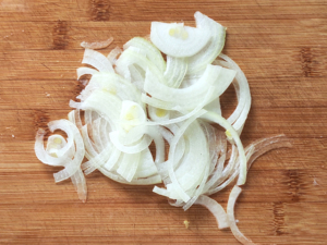 ![]() ①玉ねぎは皮をむいて、薄切りにします。 |