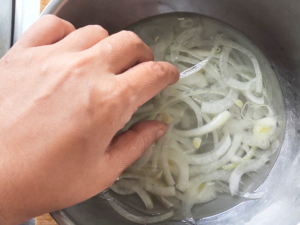 ![]() ②玉ねぎをボールに入れ、水を加えて軽く手でほぐし、一度水を捨ててから、新しい水に3~5分ほど浸します。 ③浸したら、水をしっかりと切っておきましょう。 |