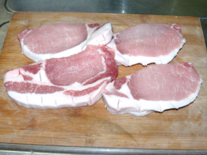 ①豚肉は、脂と身の間に垂直に包丁を入れます。(筋切り)
