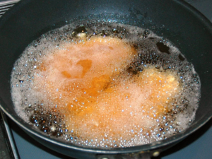 豚肉は火が通らないと危険なので、しっかりとキツネ色(こげ茶色)になるまで揚げてください。