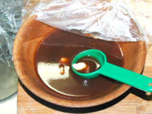 ④耐熱容器にケチャップ、醤油、みりんを入れ、ラップをして30秒レンジで加熱します。