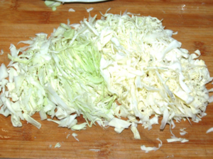 ⑥キャベツは千切りにします。