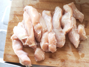①鶏むね肉は、縦に一口サイズにカットします。