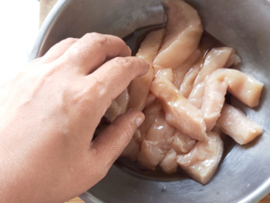 ②ボールに鶏肉とみりん、醤油を入れ手でよくもみこみ、5分ほど放置しましょう。