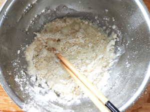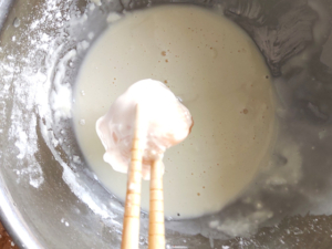 ③別のボールに、薄力粉と片栗粉、水を入れてさっと混ぜ、天ぷらの衣を作ります。