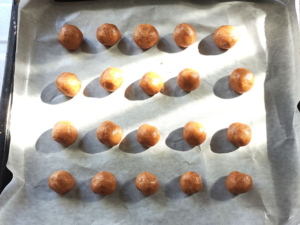 ![]() ⑥天板にクッキングシートを敷き、丸めた生地を間隔を開けて並べます。 (膨らむ心配はないので、隙間はさほど必要ありません。) |
