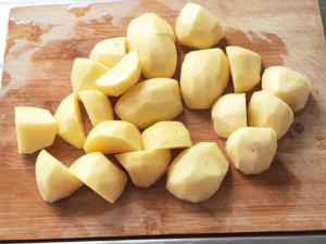 ![]() ①じゃがいもは皮をむき、それぞれ4等分に切ります。 |