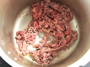 ![]() ⑤マーガリンが溶けたら、牛こまを加えて、軽く白くなるまで炒めましょう。 (この後煮るので、完全に火が通る必要はありません。) |
