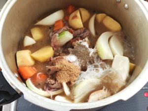 牛こまが安く手に入ったので、家にある根菜で肉じゃがにしてみました。圧力鍋を使うので、切って煮るだけの簡単調理です。ちょっとポトフみたいな仕上がりに…!