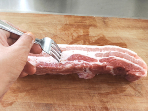 ![]() ①豚バラ肉の全面にフォークで数か所穴をあけ、味がしみこみやすくします。 |