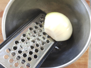 ![]() ②玉ねぎは皮をむき、おろし金ですりおろしましょう。 |