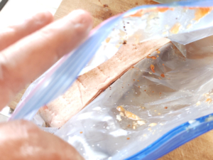 ![]() ④ZIPロックの袋に豚肉も加え、同じように外側からしっかりともみこみます。 ⑤冷蔵庫で2~3時間寝かせましょう。 |