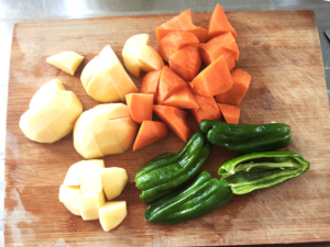 ![]() ⑥じゃがいもは皮をむいて一口大に切り、人参も皮をむいてじゃがいもと同じ大きさに切り、ピーマンは種とヘタを除いて半分にカットしましょう。 |