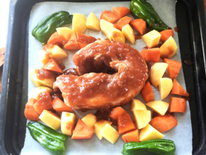 ![]() ⑦天板にオーブンシートを敷き、中央に豚肉を乗せ、周囲に切った野菜を並べます。 |