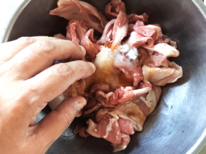 ③豚肉はボールに入れ、砂糖、豚肉用しょうゆを加え、手でもみこみます。