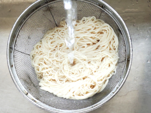 ⑦そうめんを流水で洗い、冷やすと同時にぬめりを取りましょう。