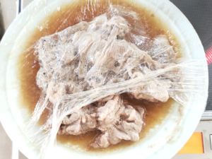 豚肉はしっかりと火を通さないと危険なので、レンジの加熱はしっかりと行ってください。