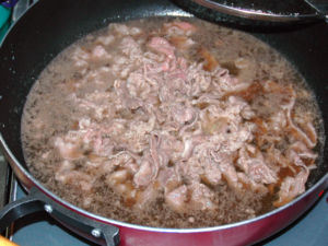 ![]() ④鍋が沸騰したら、牛コマ肉を入れて、かき混ぜながら白くなるまで火を通します。 ⑤あくが出たら、取り除きます。 |
