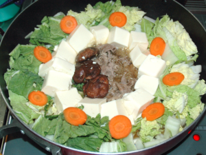 ![]() ⑥肉を中央に乗せ、同心円状に豆腐、白菜、人参、椎茸を乗せます。 ⑦蓋をして、15~20分煮て、白菜がしんなりすればOKです。 |