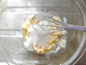 ②★タルト生地の砂糖を加え、白っぽくふわふわするまですり混ぜましょう。