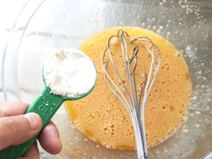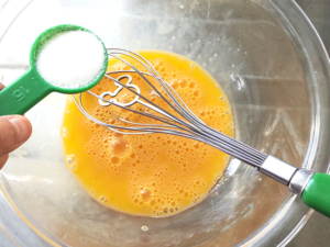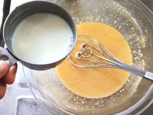⑬カスタードの卵を耐熱ボールに入れ、よく混ぜたら、カスタードの砂糖を大1ずつ加え、その都度良く混ぜましょう。