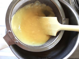 ⑰一旦カスタードクリームをこしてから、ボールに入れましょう。