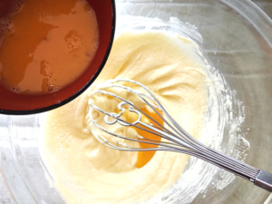 ⑭カスタードの薄力粉も大1ずつ加え、その都度良く混ぜ、バニラオイルも混ぜます。