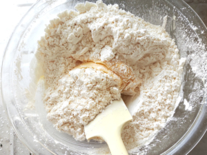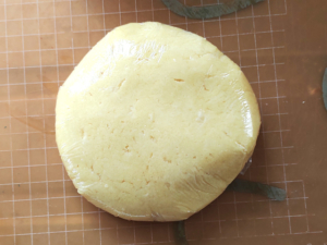 ⑤粉っぽさがなくなったら、手で球形に丸め、その後平たい円状にし、冷蔵庫で30分以上しっかりと冷やします。