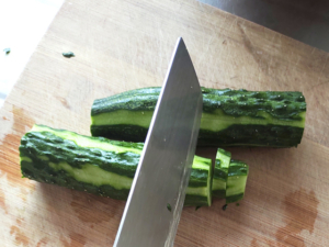 ①きゅうりは両端を数cm切り落とし、縞目に皮をむき、1cm幅に切ります。