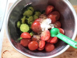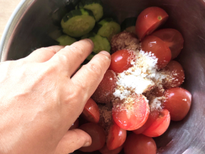 ④きゅうりから水分が出たら取り除き、ボールにミニトマト、すりごま、醤油、砂糖、カンタン酢、黒胡椒を加えます。