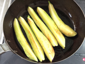 ②フライパンに高さ1cmほどの高さまで油(分量外)を入れ、なすを揚げ焼きします。