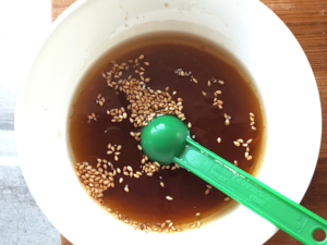⑤器に、めんつゆ、カンタン酢、ごま、ごま油を混ぜ合わせてたれを作ります。