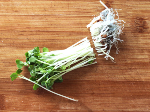 ⑦器になすを盛りつけ、貝割れを乗せたら、たれをたっぷりと回しかけて、完成です。