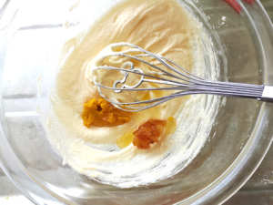 ![]() ③オレンジ果汁と皮のすりおろし、オレンジピールをマーガリンのボールに入れ、しっかりと混ぜ合わせます。 |