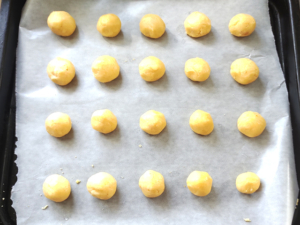 ![]() ⑦天板にクッキングシートを敷き、丸めた生地を間隔を開けて並べましょう。 (膨らむ心配はないので、隙間はさほど必要ありません。) |
