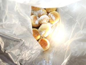 ![]() ⑧粗熱が取れたら、ビニール袋に粉砂糖を入れ、クッキーも入れて全体に粉をまぶします。 |