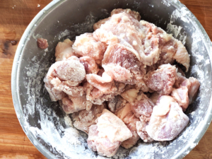 ![]() ③ボールに片栗粉を加え、鶏肉全体に粉をまぶします。 |