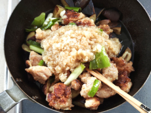 ![]() ⑩フライパンに鶏肉、ねぎ、ナスを加え、大根おろしとめんつゆで作った調味料を絡めます。 ⑪さっと火を通して、大根の辛みをマイルドにしましょう。 (辛みが気にならない場合は、火を通さなくても大丈夫です。) |