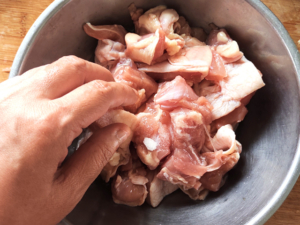 ![]() ②ボールに鶏肉と酒、塩を入れて手でもみこみ、10分ほどおきましょう。 |