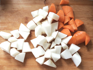 ![]() ③鶏肉を休ませている間に、野菜を処理します。 ④大根と人参の皮をむき、同じサイズの小さな乱切りにします。 |