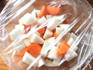 ![]() ⑤耐熱ボールに人参と大根を入れ、ラップをして、レンジで6~8分加熱しましょう。 |