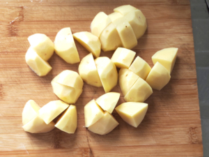 ![]() ⑥じゃがいもは皮をむき、小さめの一口大に切ります。 ⑦人参と大根の加熱が終わり次第、同じように耐熱ボールに入れてラップをし、6~8分加熱しておきましょう。 |