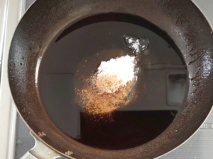 ![]() ⑧フライパンをきれいにしてから、砂糖、醤油、みりん、ほんだしを加え、弱火で加熱して調味料を溶かします。 |