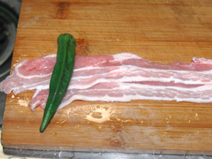 ④まな板の上に、肉がずらして重なるように2枚乗せ、端にオクラを置いて、きつめにクルクルと巻きます。