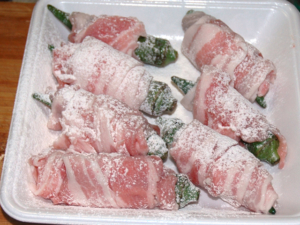 ⑤オクラを全て巻き終えたら、小麦粉を茶こしなどに入れて、肉の上からふるっておきましょう。
